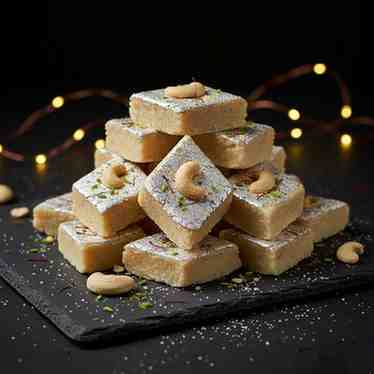 Once the mixture reaches a fudgy consistency, it is flavored with cardamom powder, which adds a delightful aromatic touch. The mixture is then spread evenly on a greased tray or plate and left to cool. After cooling, it is cut into diamond-shaped or square pieces.