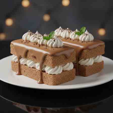 The Light Chocolate Cream Pastry is beautifully finished with a dusting of powdered sugar on top. This adds an elegant touch and enhances the visual appeal of the pastry. It is often garnished with chocolate curls or a drizzle of chocolate sauce, adding an extra layer of chocolatey decadence.